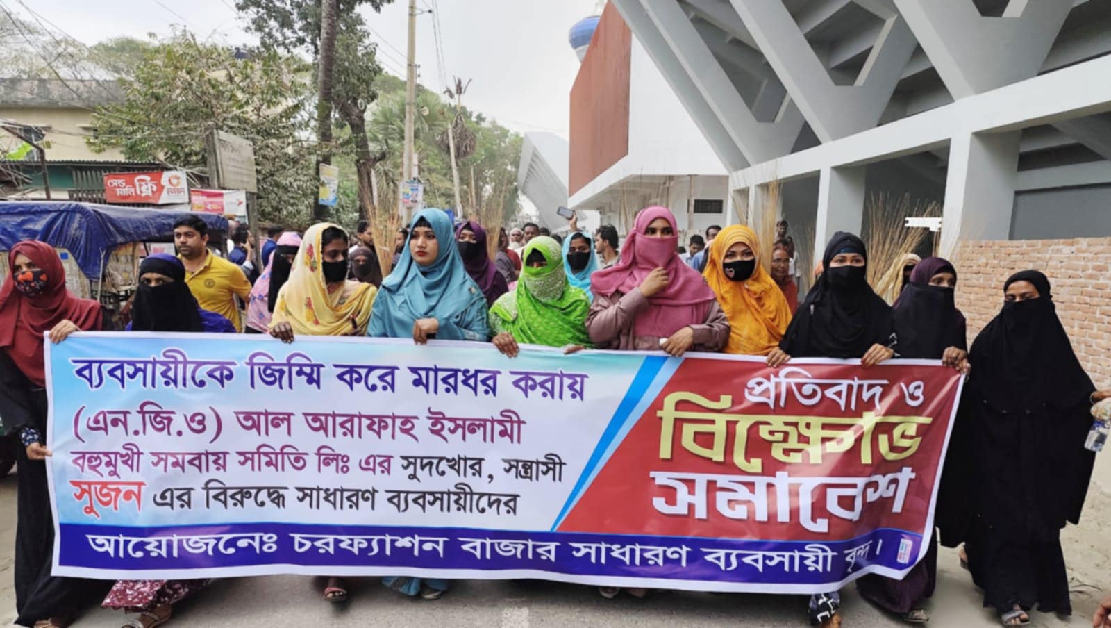 জানাযায়,বহিরাগত ওই সুদকারবারী মো. সুজন মিয়া চরফ্যাসন সদরে আল আরাফা নামের একটি ক্ষুদ্র ঋণ ব্যবসায়ী সাইনবোর্ড টানিয়ে তিনি চড়া সুদের কারবার করে আসিলেন। ক্ষুদ্র ঋণের পাশাপাশি তিনি ব্যবসায়ীদের চড়া সুদের ব্যবসায় জড়ান। এবং চরফ্যাসন বাজারের ক্ষুদ্র ব্যবসায়ীদেরকে ফাঁদে ফেলে তিনি ঋণ হিসেবে বিভিন্ন অংকের টাকা দিয়ে ওই টাকা তিনি চড়া সুদসহ আদায় করেন। তার চড়া সুদের টাকা দিতে ব্যবসায়ীরা অস্বীকার করলে একাধিক ব্যবসায়ীকে মারধর করেন। সুদকারবারীর হাত থেকে রক্ষা পেতে গতকাল বুধবার দুপুরের কয়েকশ ক্ষুদ্র ব্যবসায়ীরা তার অবৈধ সুদের কারবার বন্ধ ও ব্যবসায়ীদের মারধর করে চড়া সুদ আদায়সহ তার বিচারের দাবীতে প্রতিবাদে ঝাঁড়– মিছিল ও প্রতিবাদ সমাবেশ করেন। চরফ্যাশন সদর রোডে অনুষ্ঠিত সমাবেশে বক্তৃতা করেন বাজার ব্যবসায়ী সমিতির সাধারন সম্পাদক নজরুল ইসলাম টিপু। সমাবেশে ব্যবসায়ীরা অভিযোগ করেন, সুদব্যবসায়ী সুজন মিয়া কিস্তির টাকার জন্য বাজার ব্যবসায়ী কামাল হোসেনকে ঘরের দরজাবন্ধ করে আটক রাখেন এবং মারধর করেন। অবরুদ্ধ এবং আক্রান্ত কামালকে উদ্ধারের চেষ্টা করতে ব্যর্থ হন বাজারের অন্যান্য ব্যবসায়ীরা। ফলে কামালকে উদ্ধারে এগিয়ে যান স্থানীয় বিএনপির নেতা খায়রুল ইসলাম সোহেল। এতে ক্ষুদ্ধ হয়ে সুদব্যবসায়ী সুজন মিয়া বিএনপি নেতা খায়রুল ইসলাম সোহেলকে নিয়ে অপপ্রচার চালান। এবং ভোলা সদর প্রেসক্লাবে গিয়ে তাকে জড়িয়ে মিথ্যা অপবাদ দিয়ে সংবাদ সম্মেলন করেন। ক্ষুদ্ধ ব্যবসায়ীরা এসব অপপ্রচার বন্ধের আহ্বান জানান।
