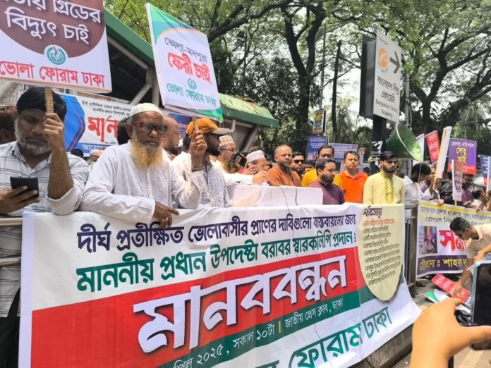 ভোলা-বরিশাল নির্মাণ কাজ দ্রুত বাস্তবায়ন, ভোলায় উৎপাদিত গ্যাস ব্যবহার করে জেলায় সার কারখানা শিল্পকারখানা গড়ে তোলা, জেলায় একটি মেডিকেল কলেজ ও হাসপাতাল এবং একটি পাবলিক বিশ্ববিদ্যালয় স্থাপনসহ ভোলাবাসীর ন্যায্য দাবি আদায়ের লক্ষ্যে জাতী প্রেসক্লাবের সামনে মানববন্ধন করে ভোলা ফোরাম, ঢাকা।
