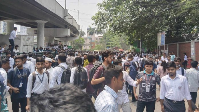 দুপুর পৌনে ১২টার দিকে রাজধানীর তেজগাঁওয়ে ঢাকা পলিটেকনিক ইনস্টিটিউটের মূল ফটকের সামনে মানববন্ধন কর্মসূচি শুরু করেন শিক্ষার্থীরা।
