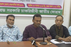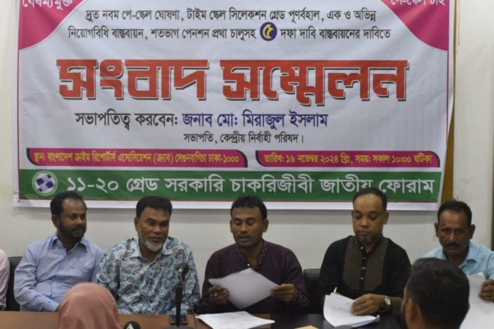 দ্রুত নবম পে-স্কেল ঘোষণা, অর্ন্তবর্তীকালীন সময়ের জন্য ৫০% মহার্ঘভাতা প্রদান সহ ৫ দফা দাবিতে সংবাদ সস্মেলন করেছেন ১১-২০ গ্রেড সরকারি চাকরিজীবী জাতীয় ফোরাম। শনিবার বাংলাদেশ ক্রাইম রিপোটার্স এসোসিয়েশনে (ক্র্যাব) এ সংবাদ সম্মেলন অনুষ্ঠিত হয়। সংবাদ সম্মেলনে সভাপতিত্ব ও লিখিত বক্তব্য পাঠ করেন সংগঠনের কেন্দ্রীয় নির্বাহী পরিষদের সভাপতি মো: মিরাজুল ইসলাম। তিনি বলেন, আগামী ১৫ই ডিসেম্বর এর মধ্যে ৫ দফা দাবী বাস্তবায়নে যথাযথ পদক্ষেপ গ্রহণ করা না হলে কর্মবিরতিসহ কঠিন কর্মসূচি ঘোষণা করা হবে।